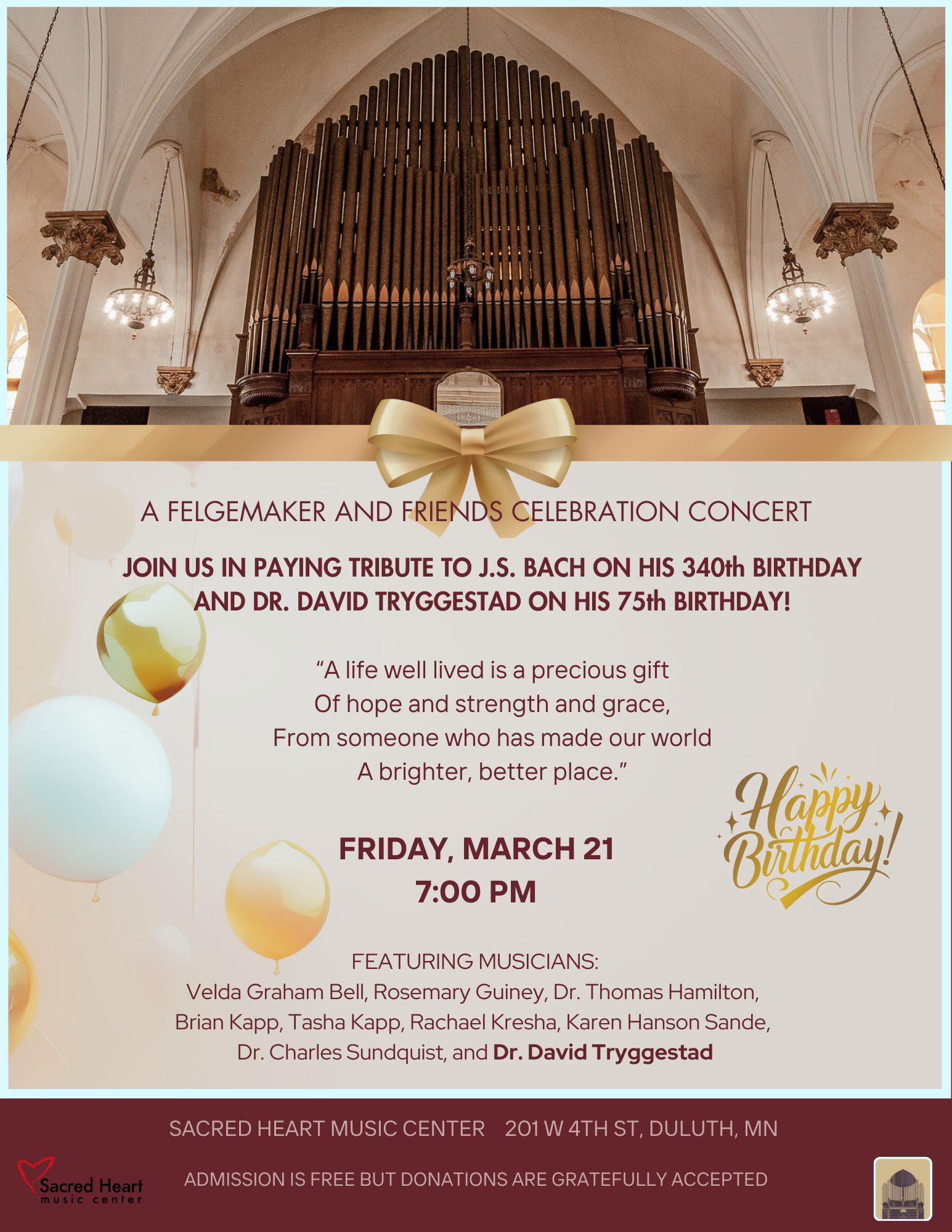 Sacred Heart Music Center 201 West 4th Street, Duluth, MN, United StatesJoin the Friends of the Felgemaker in paying tribute to Johann Sebastian Bach on his 340th birthday and Rev. Dr. David Tryggestad on his 75th birthday on Friday, March 21 at 7 p.m. at Sacred Heart Music Center. This birthday concert will feature musicians Velda Graham Bell, Rosemary Guiney, Thomas Hamilton, Brian Kapp, Tasha Kapp, […]