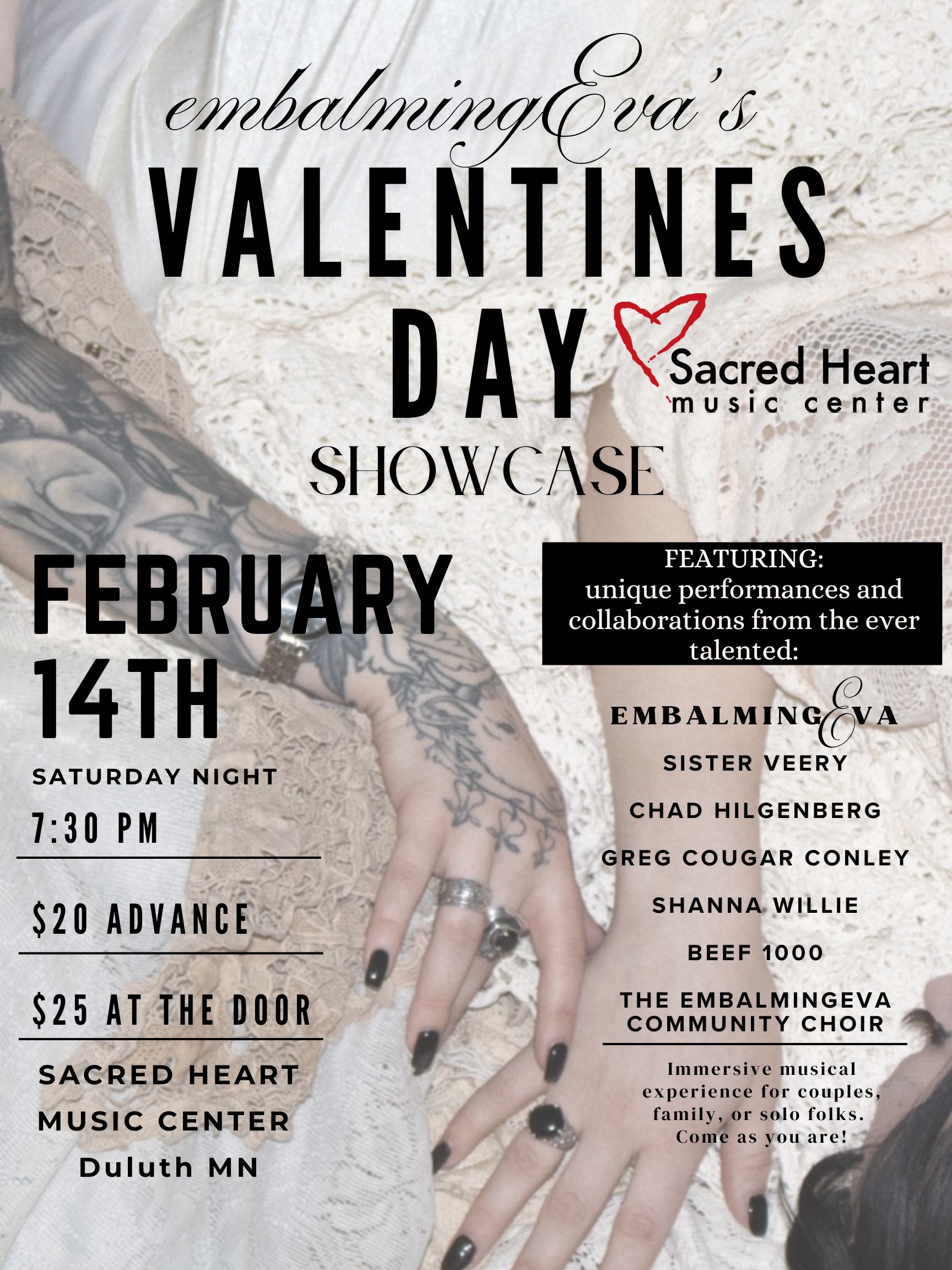Sacred Heart Music Center 201 West 4th Street, Duluth, MN, United StatesDuluth electronic duo embalmingEva host a special Valentine's Day showcase featuring performances from a variety of Twin Ports artists at 7:30 pm Saturday, Feb 14. A self taught, moody female syth duo, embalmingEva has earned wide critical praise for their original music and creative staging. The showcase will feature unique performances and collaborations with other […]